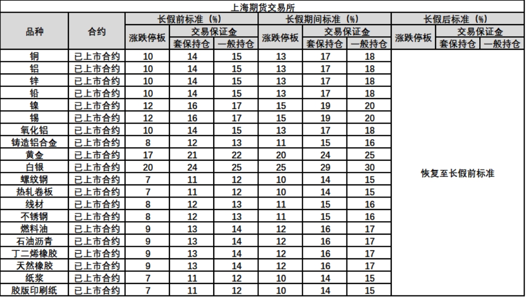 其他品種期貨合約的交易保證金標準和漲跌停板幅度恢復至調(diào)整前水平。
