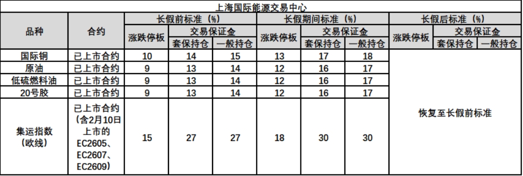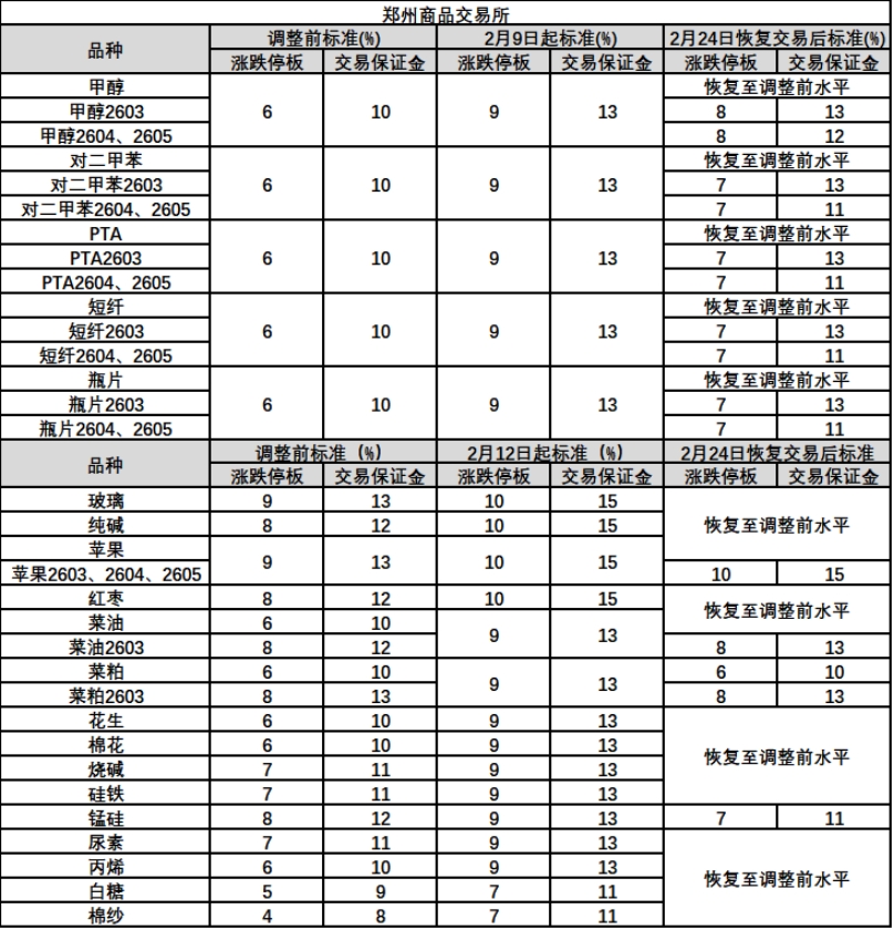 2026年2月24日(星期二)交易后,自第一個未出現(xiàn)單邊市的交易日收盤結算時,涉及調(diào)整的期貨合約漲跌停板幅度和交易保證金比例恢復至原有水平。