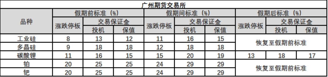 2026年2月24日(星期二)恢復交易后,在各品種期貨持倉量最大的合約未出現(xiàn)漲跌停板單邊無連續(xù)報價的第一個交易日結算時起,工業(yè)硅、多晶硅、鉑、鈀期貨合約漲跌停板幅度、投機交易保證金標準和套期保值交易保證金標準恢復至調(diào)整前水平;碳酸鋰期貨合約漲跌停板幅度調(diào)整為13%,投機交易保證金標準調(diào)整為15%(我司17%),套期保值交易保證金標準調(diào)整為14%(我司17%)。