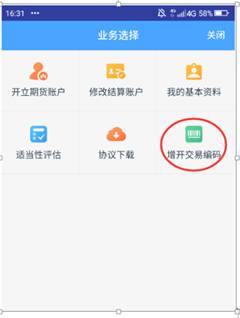 ★溫馨提示:網(wǎng)上開戶服務(wù)時(shí)間:周一至周五上午 09:00-11:30 , 下午 13:00-17:00。 增開交易編碼:對(duì)于存量客戶,選擇此項(xiàng)可申請(qǐng)其他未開通的交易所編碼。 增開交易編碼流程圖