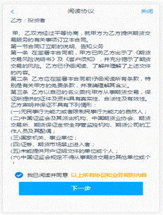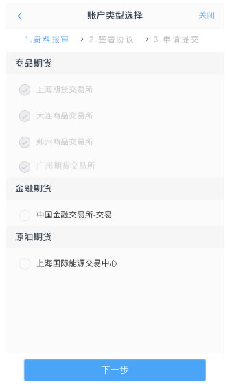 (4)下一步進(jìn)入賬戶選擇頁面。在賬戶選擇頁面,展示出客戶在本期貨公司已開通的交易所信息并做置灰處理,對(duì)已開通的交易所不允許客戶對(duì)其進(jìn)行修改,客戶可以勾選想要開通的交易所。此項(xiàng)業(yè)務(wù)根據(jù)我司開戶流程,暫時(shí)只接受中金所和能源中心的二次開戶(即已在其他公司開通過中金所或能源中心的交易編碼,且未銷戶)。