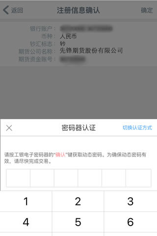 輸入工銀電子密碼器上的動(dòng)態(tài)密碼,點(diǎn)擊確定完成銀期簽約注冊(cè)
